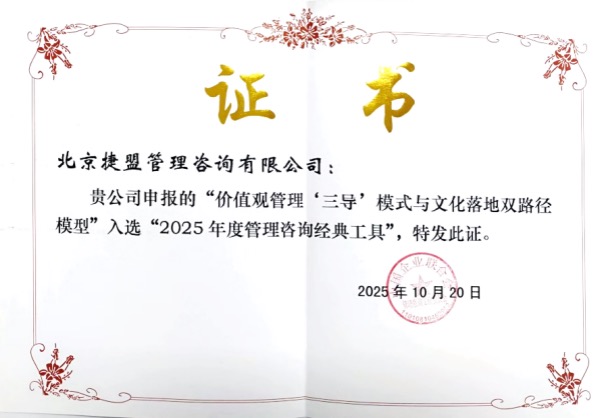 捷盟咨询自主研发的“价值观‘三导’模式与文化落地双路径模型”被评为2025年度管理咨询经典工具。
